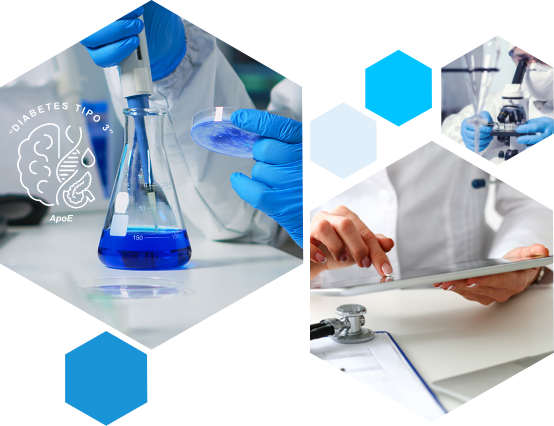 Nuestro enfoque innovador se centra en la Nuestro enfoque innovador se centra en la identificación de marcadores de riesgo clave que predisponen fuertemente a desarrollar Alzheimer , que principalmente incluyen el genotipo APOE (especialmente las variantes ε2, ε3 y ε4), combinado con un análisis exhaustivo de datos clínicos y familiares integrados sobre la DT2 y la EA que se han estructurado en un novedoso algoritmo de riesgo.